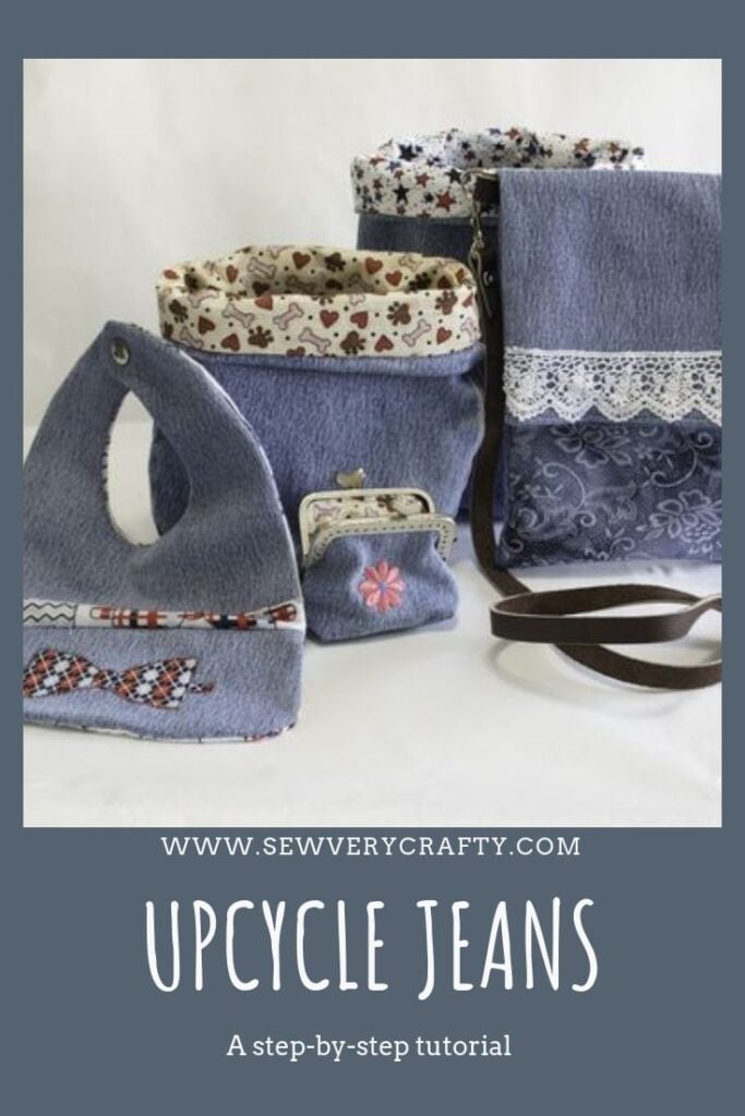 Upcycling old jeans is a terrific way to reuse and re-purpose something that would be thrown away otherwise. In this post there are 5 simple ways to upcycle old denim jeans into new looks. I created a skirt, a matching cross body bag, a coin purse, a baby's bib and two little storage containers all from one pair of upcycled denim jeans. You can re-purpose your own jeans in no time at all. This post contains affiliate links that if you click on them and make a purchase I may receive a small commission at no extra cost to you.