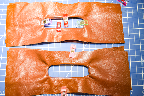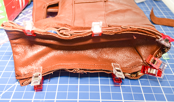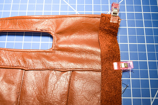 Fold over the binding so that there are no raw edges. Clip. Hand stitch the binding using ladder stitch. You have now finished your leather basket weave clutch.