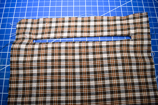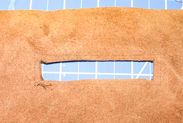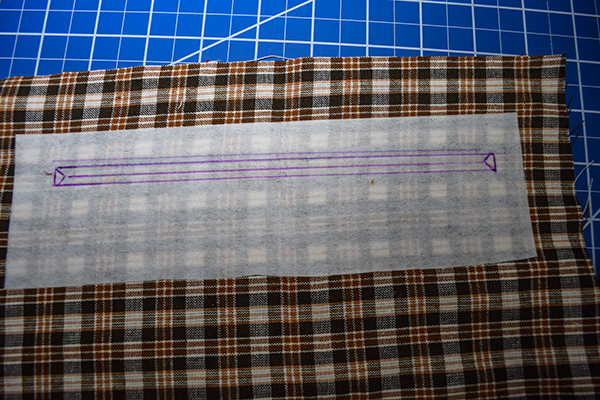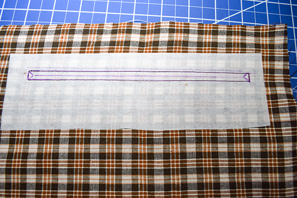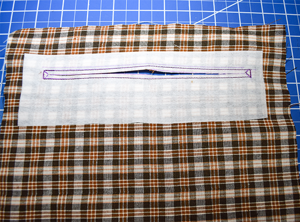 Place the interfacing strip 2″ down from the top of the lining. Draw a rectangle in the center of the interfacing piece that measures 3/8″ x 7″. Stitch all the way around the rectangle. Cut a straight line down the center of the rectangle until you reach each end then cut toward each corners creating a triangle at each end. Fold the raw edges back toward the wrong side of the lining and press.
