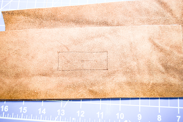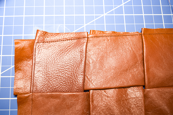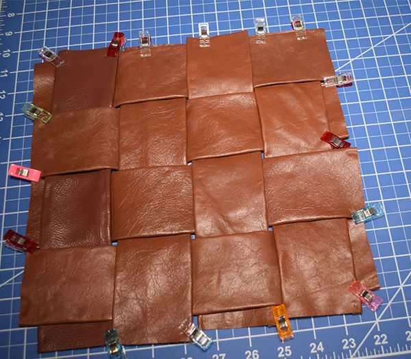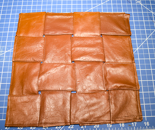 Place four of the leather strips right sides up on your work station. Weave the other four strips over and under the first set of strips to create the basket weave pattern. Stitch all the way around using a 1/8″ seam allowance. Once the perimeter has been stitched topstitch all of the woven pieces.