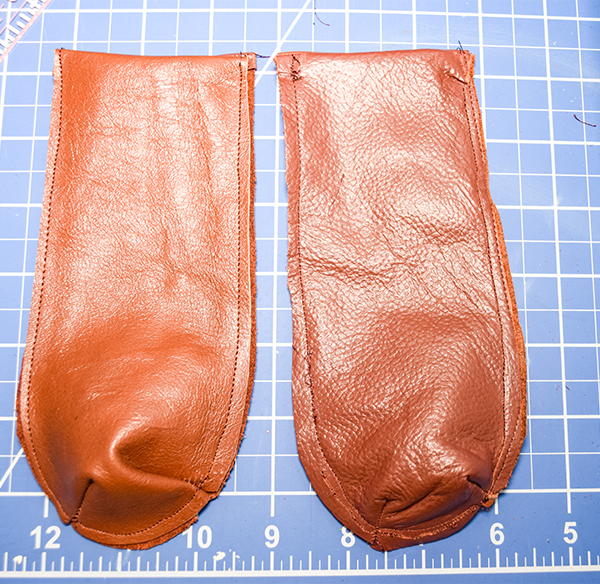 Stitch the darts on the bottom of the side pieces. To do this, fold the sides of the dart right sides right sides together. Stitch along the dart lines. Trim off the excess. Place the side pieces right sides together. Stitch along the short straight ends. Fold the pieces so they are right sides out. Stitch all the way around using a 1/8″ seam allowance.
