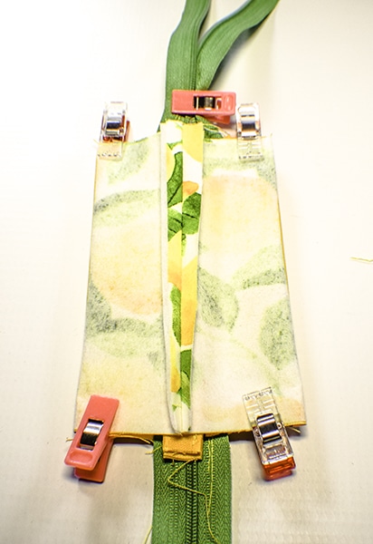 Open the zipper at least half way. Line up the bottom seam of the outer fabric and the lining fabric with the zipper teeth. Add the tab on top of the zipper so that the swivel clip is facing toward the inside of the bag. Stitch across all layers on both ends using a 1/4″ seam allowance. Clip off any excess zipper and seam to 1/8″ seam allowance.Â
