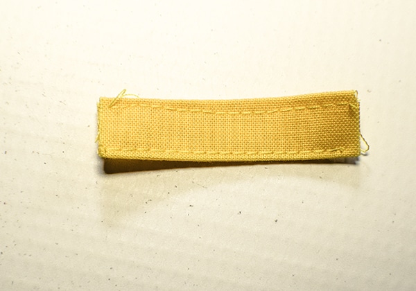 Fold the raw edges into the center and press. Fold in half again enclosing the raw edges and press. Top stitch on both sides of the tab. Insert the tab into the swivel clip. Â