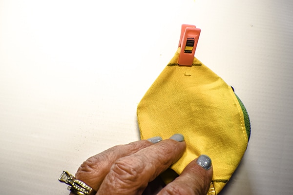 Turn the bag through the lining so that only the lining is facing outwards and the outer bag is inside the lining. Stitch the opening closed using ladder stitch. If you are unfamiliar with ladder stitch check out this video. Press the bag flat making sure that all of the corners have been poked out. I like using That Purple Thang for this process which you can get here. Pinch the corners so the side is against the bottom and draw a line diagonally across all four corners that measures 1″. Stitch along this line to box the corners.Â