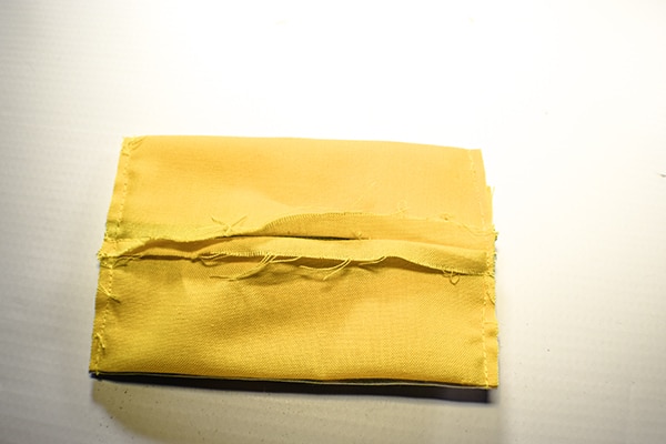 Cut two outer, two lining and two interfacing pieces that measure 5″ x 3.5″ and one tab piece that measures 2″ x 2″