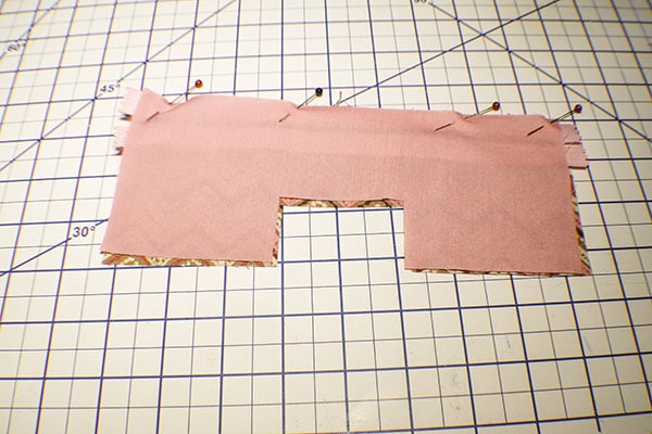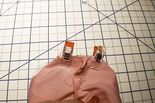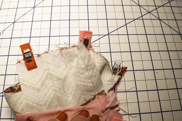 You will notice that there are four corners with holes. Pinch the sides and bottom to create a straight line on the outer fabric. Do the same for the corresponding lining fabric. Clip the lining and outer fabric pieces together using wonder clips or pin. Repeat for the other side. Stitch along the lines using a 3/8″ seam allowance. Trim the seams. Turn the pouch right sides out through the opening in the lining and the zipper.