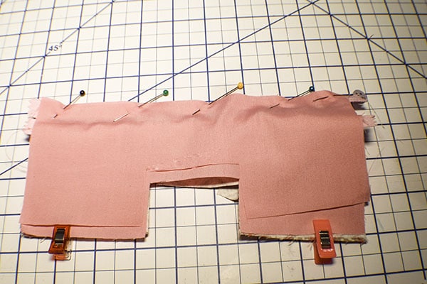 Pinch the outer sides together and the lining sides together matching the seams. Clip or pin. Stitch along the outer bottom that was created when you matched the sides. Stitch along the lining bottom in the same way but leave an opening for turning the piece right sides out in a later step.