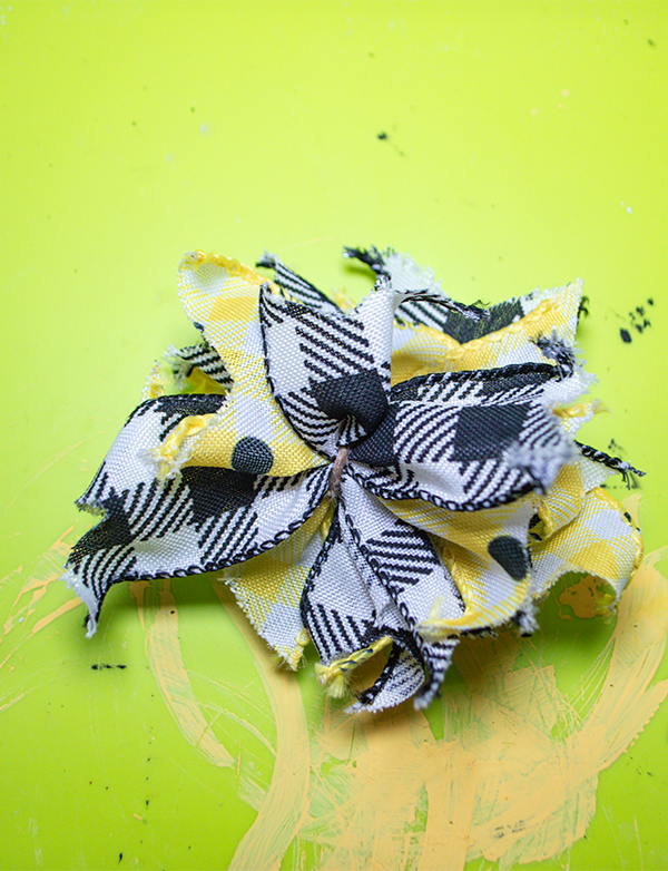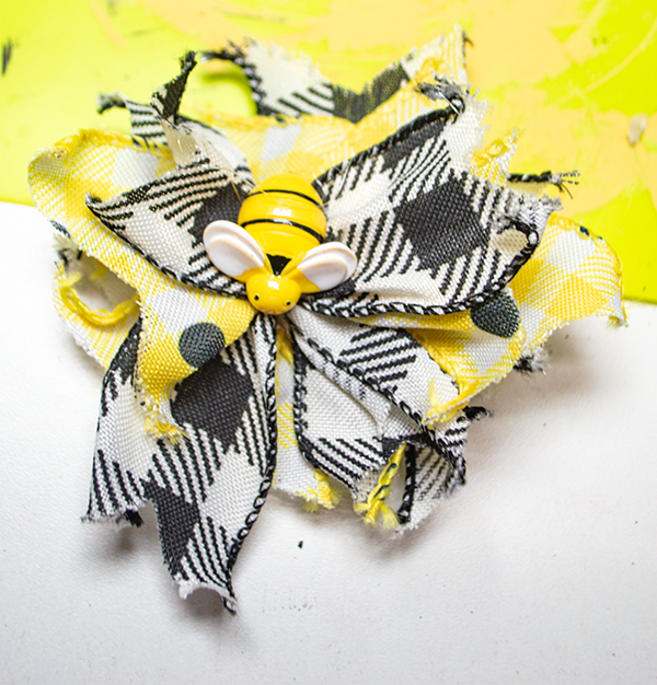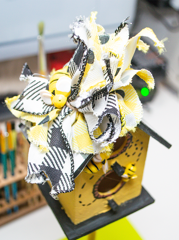 Create a small bow by taking small strips of black and yellow ribbon and cut dove tails by folding the ends in half and cut diagonally downward toward the end of the ribbon. I cut four of the yellow and four black. I stacked them by alternating the yellow and black. Secure them by using a piece of twine. Add abee to the center of the bow.