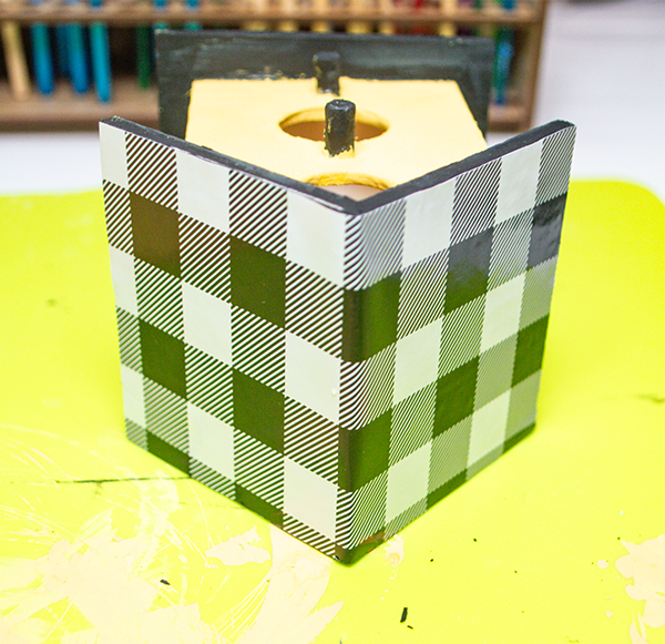 Place a piece of Dollar Tree buffalo check vinyl on the roof of the house. Trim off any excess using a craft knife or some sand paper.
