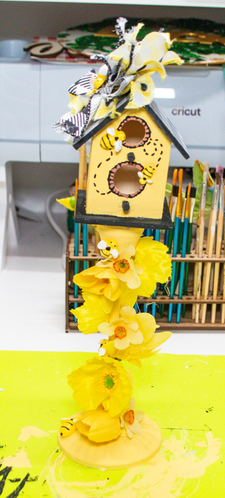 Starting at the bottom of the candle stick hot glue some yellow faux flowers. Continue wrapping flowers around the candle stick until you get to the bottom of the birdhouse. Add a few bees along the way. Once the flowers and bees have been added you have finished your Dollar Tree Bee Themed birdhouse.
