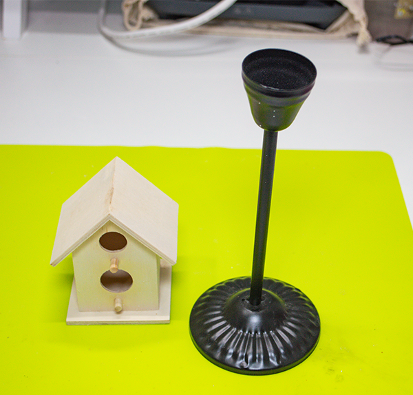 Using a combination of hot glue and e6000 glue the birdhouse to the top of the candle stick.