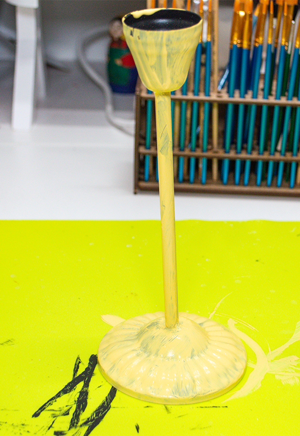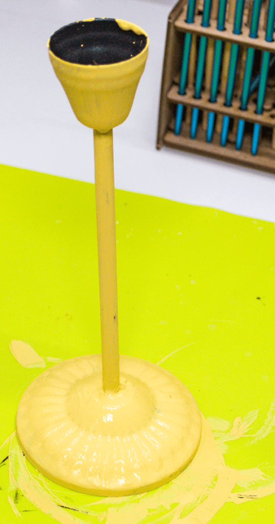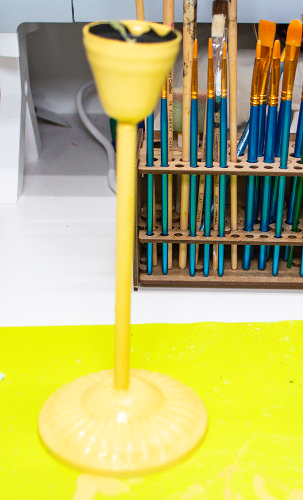 Paint the candle stick using the yellow chalk paint. Let the paint dry and add another coat.