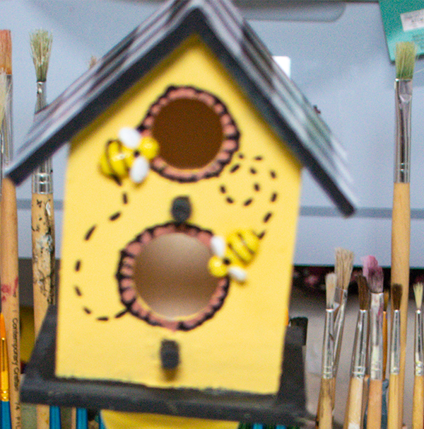 Start by adding some bricks around the holes in the birdhouse. I just placed some black boxes around the holes and colored them in using a brown paint pen. Place one of the bees on the front of the bird house. Use the paint pen to draw a few dotted lines to represent the flight of the bee.
