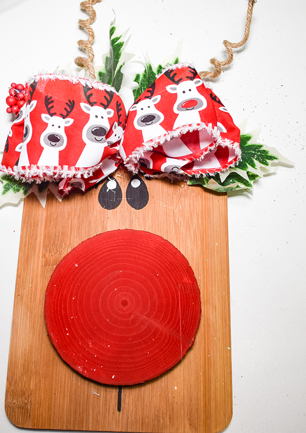 Take some Christmas greenery and hot glue it to the center of the antlers as shown. Hot glue the bow to the top front of the cutting board. Finally, glue on the rusted jingle bell.