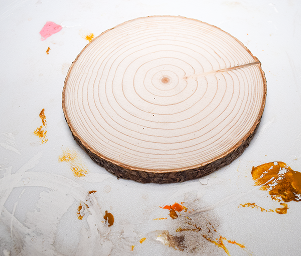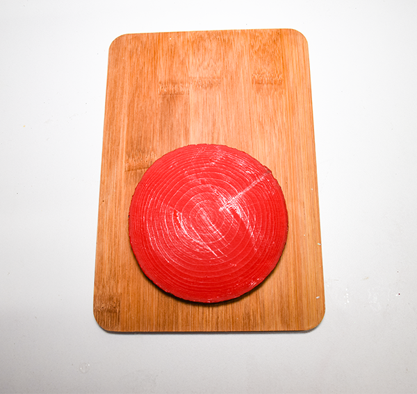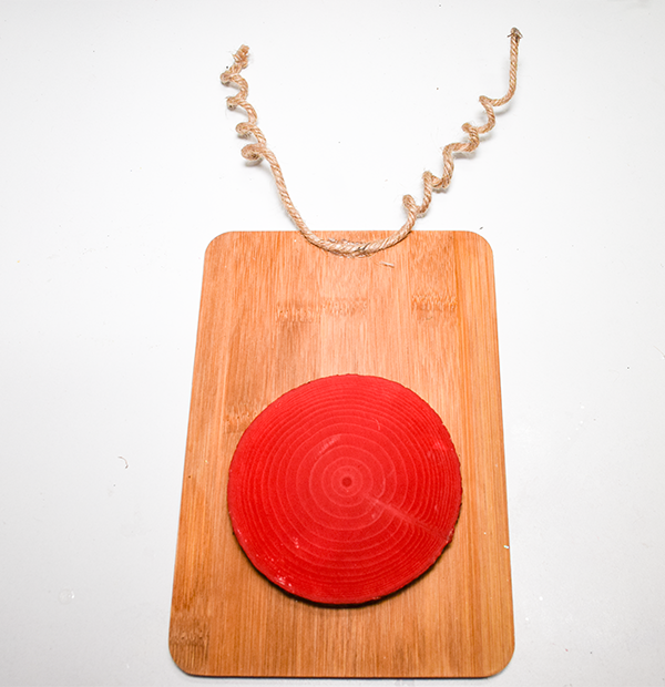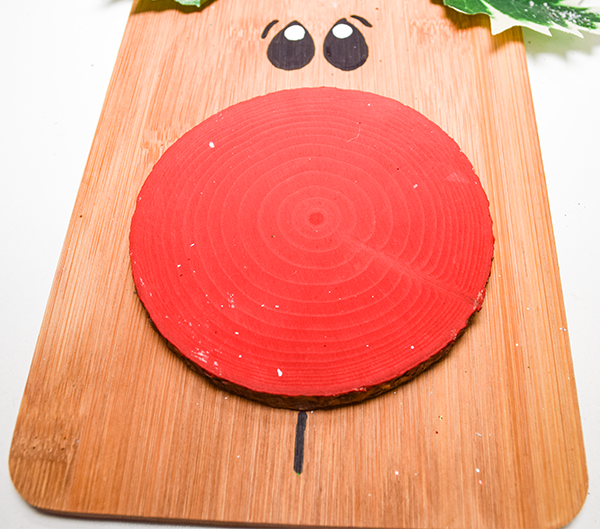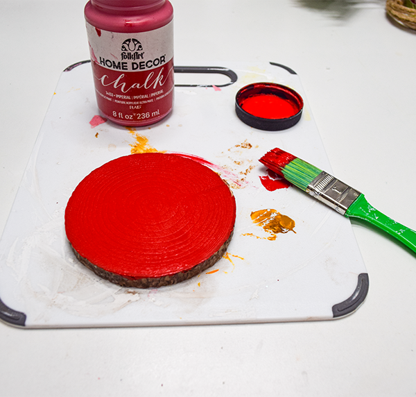 I used a natural wood round that I purchased at Michael's for Rudolph's nose. Any wood round will do so long as it is less than 3.87 in diameter. You want it relatively large but not overwhelming. Using the red chalk paint cover the round with a nice even coat.