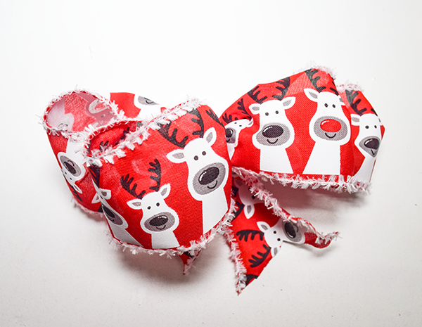 Choose any Christmas themed wired ribbon for the bow. If you have difficulty with creating bows head over to Southern Charm Wreaths and take their bow making course. You can also use a Bowdabra. I chose a bow with two loops on either side. Dovetail to ends of the ribbon.