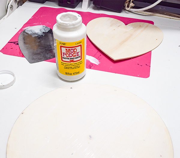 Cover the wood round and the metal heart with Mod Podge. Let the Mod Podge dry completely.