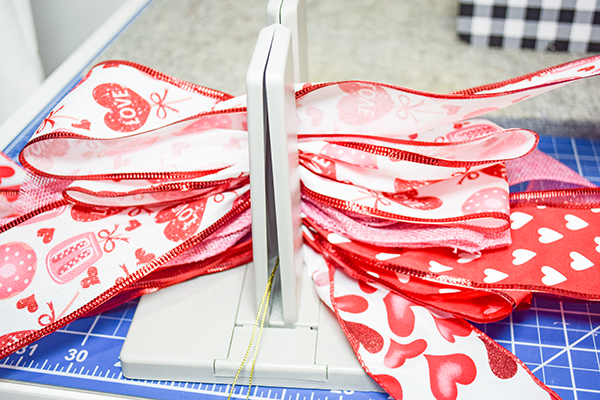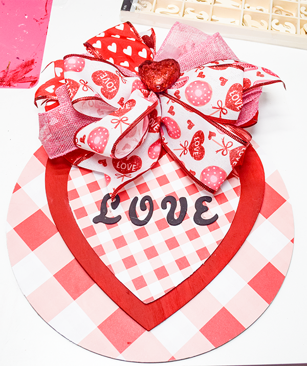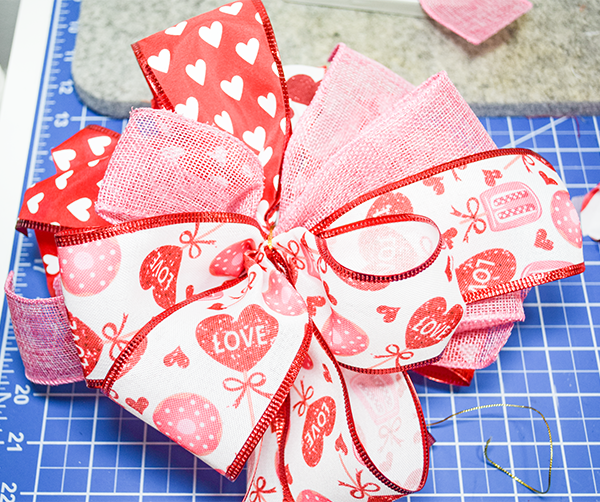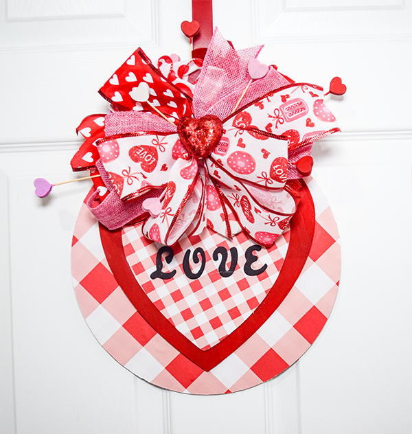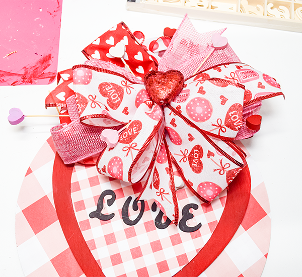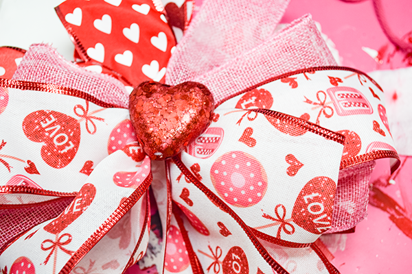 Hot glue the heart picks throughout the bow to really add pizzazz and dimension. Once the picks have been added you have finished your Dollar Tree Valentine's Door Hanging.