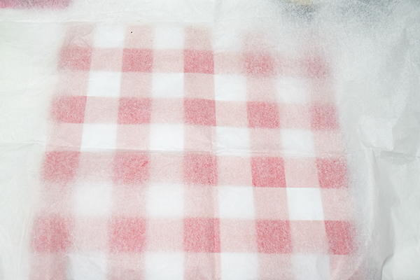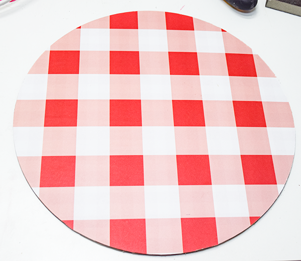 Place different sides of the double sided paper on the round and the heart. Cover with a piece of parchment paper. Heat with a small iron to fuse the paper to the round and the heart. Once the pieces have cooled down use sandpaper to remove the excess paper. Cover with another layer of Mod Podge.