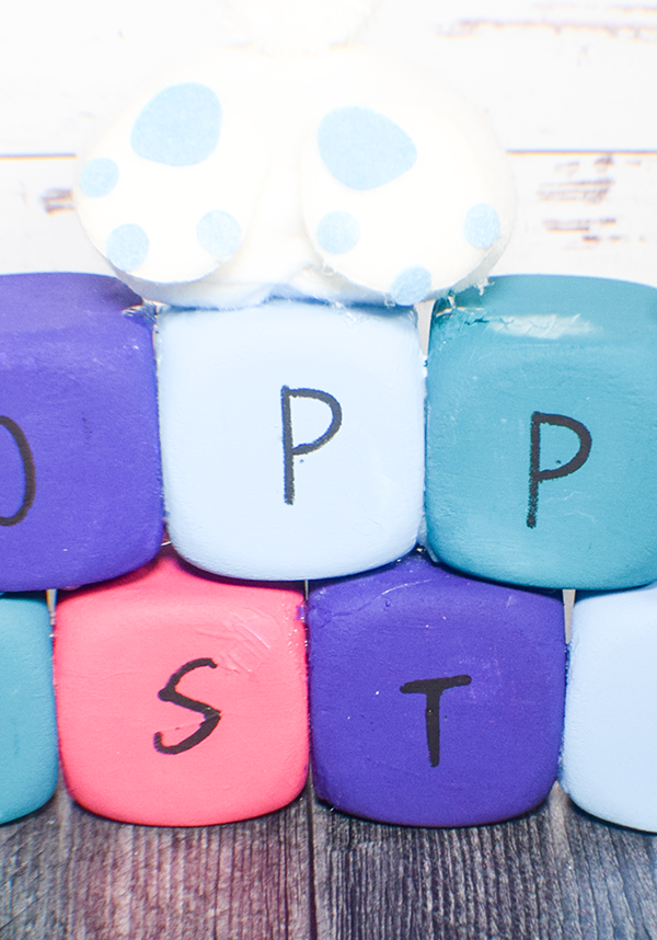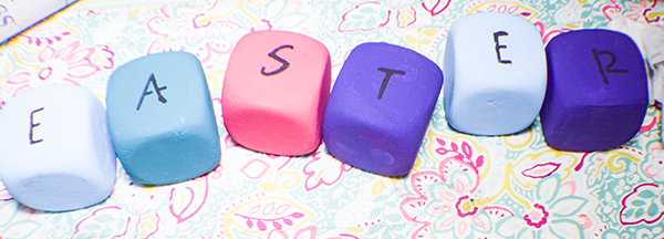Add the letters HOPPY EASTER to the Dice. I used a stencil for this purpose but you can use adhesive letters, letter stamps or paint your own. I used black paint for mine but you can choose any color you like.