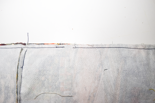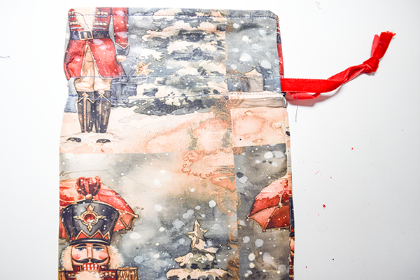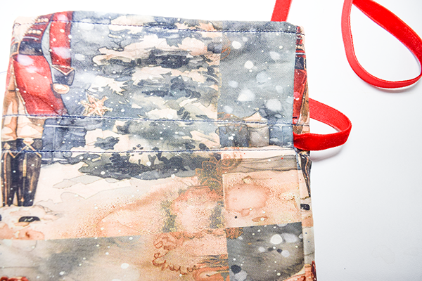 Turn the bag right sides out so that the short edge seam in the center is on the top edge. Push one side into the other. Take a ruler and an erasable pen or chalk and draw lines around the bag on the top and bottom of the opening. Topstitch on those lines to create the ribbon casing. Topstitch around the top.