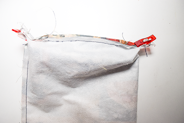 Fold the entire bag right sides together lengthwise. Start by stitching on one short edge. Stitch two inches or so then leave an opening for turning. Continue to stitch the rest of the short edge and up the long edge until you reach 2 7/8″ from the top short edge seam you stitched in the previous step. Skip 7/8″ then continue stitching down an additional 4”. Skip 7/8″ then complete stitching the remaining raw edges. You will notice that there is a 7/8” opening to thread the ribbon through.
