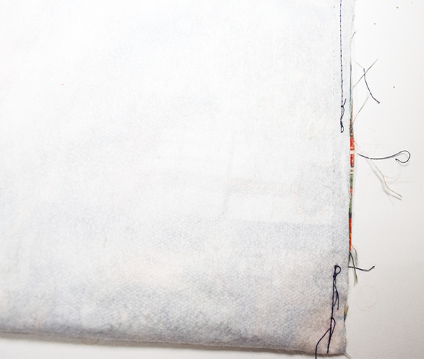 Box all four of the corners. To do this pinch the side seam to the bottom seam on the stitched side and the bottom seam to the folded side to create a triangle. Measure down about 1” from the tips. Stitch on the 1″ line. Cut off the excess fabric and turn right sides out through the opening in the bottom. Stitch the opening closed using ladder stitch. I like ladder stitch because it is invisible so if you want to use the other side you will not see where you closed the opening.