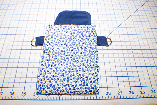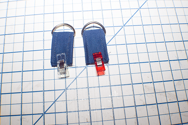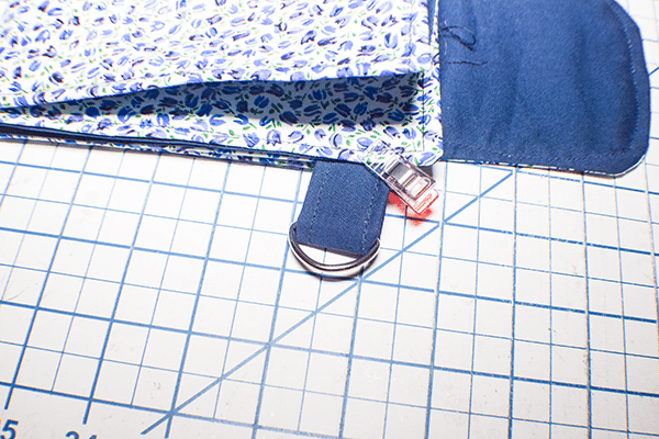 Measure down about 1″ from the top of the bag. Insert the D-Ring tabs between the middle two layers and clip in place. Topstitch through the center layers only including the tab pieces.