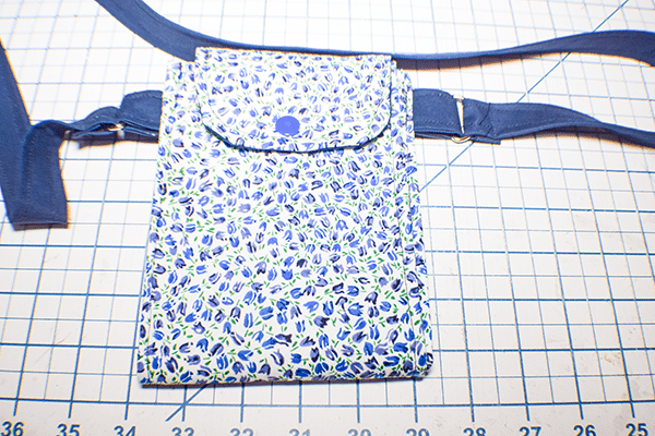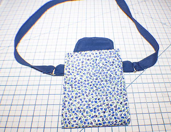 Insert the strap ends to the other side of the D-Ring. Double fold and stitch along the end to secure. You ave now finished your simple three pocket crossbody bag. Fill and enjoy.