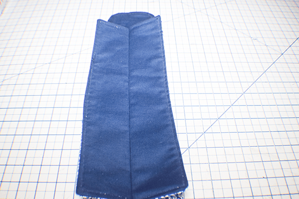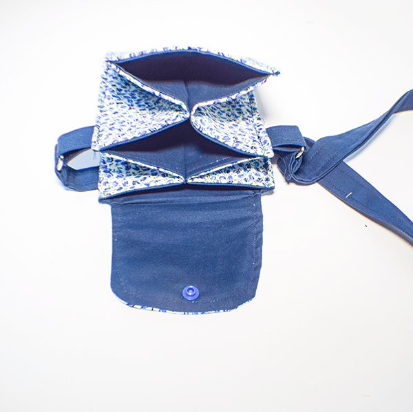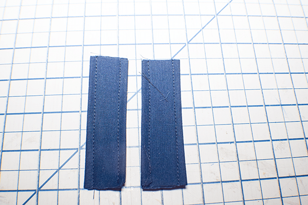 Create the tabs and the strap in the same way. To do this fold the pieces so that the long raw edges are folded to the center. Press. Fold in half again lengthwise to enclose the raw edges. Topstitch along the long edges to secure. Add the D-Rings to the tab pieces and fold the tab pieces in half widthwise to secure the D-Rings.