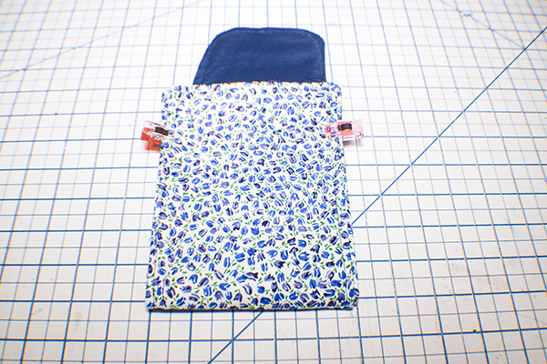 Place the outer and lining pieces right sides together. Using a 3/8″ seam allowance stitch the all the way around the two pieces leaving an opening on one side for turning. Clip the corners. Turn the piece right sides out and press.
