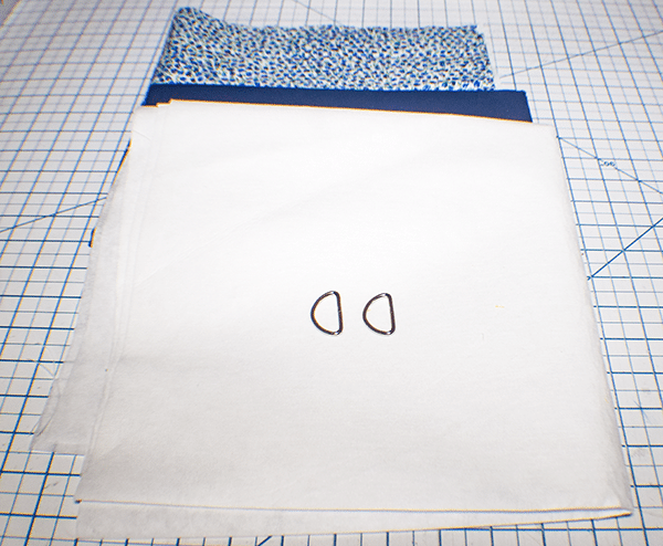Cut one piece each of outer, lining and interfacing that measure 16 1/2″ x 18″. Cut two pieces of outer or lining fabric that measures 4″ x 2″ for the D-Ring tabs. From the outer or lining fabric cut a long piece that measures 4″ x the width of the fabric for the strap. You can make the strap longer if you like.