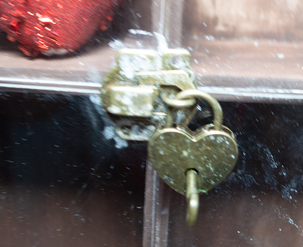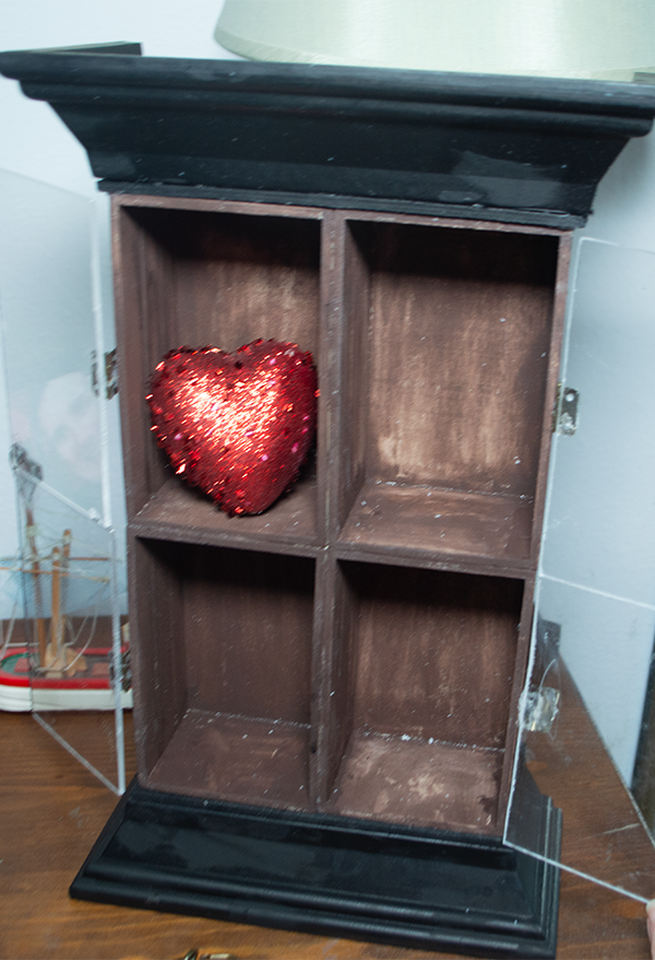Using hot glue attach one half of the latch on one side of two acrylic boards. This will join two of the boards together vertically. Next, add the other half of the latch to the other two acrylic boards. Make sure that you measure so that the latch will close in the center. Once the latch has been added you have finished your small Dollar Tree curio cabinet. Fill and enjoy.