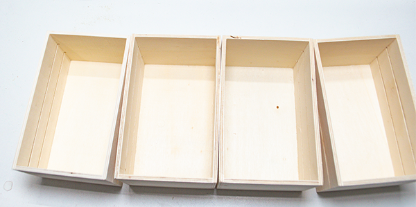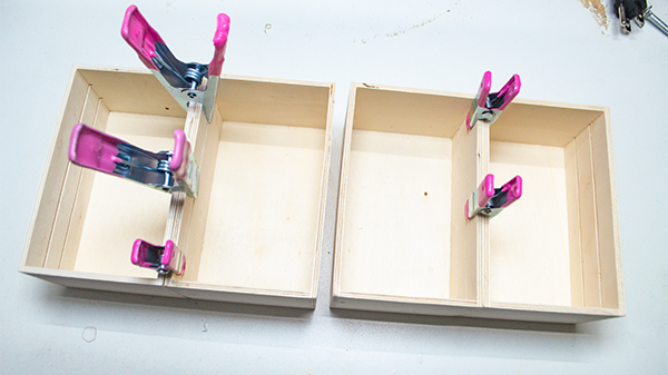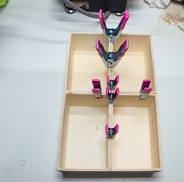 Place some wood glue and hot glue on the long sides of the crates. Glue two crates together. Repeat for the second pair of crates. Clamp the pieces together letting the glue set. Add wood glue and hot glue to the short ends of the glued crates and glue the two pieces together. Clamp them together letting the glue set. You should have a large box for sections.