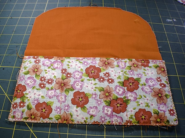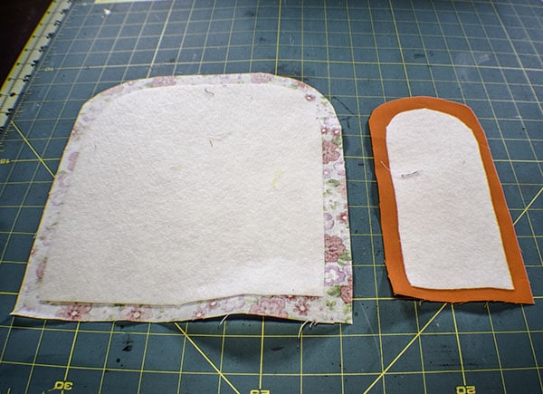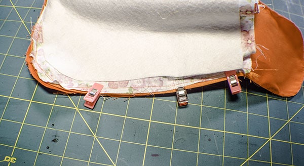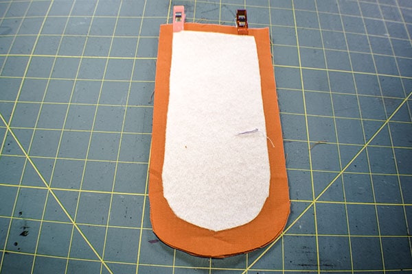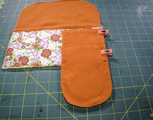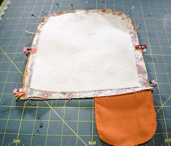 Place the larger fleece piece onto the outer fabric piece that measures 9 5/8″ x 10″ in the center and fuse. Place the large outer piece on top of the corresponding lining piece and clip. Trim the rounded edge keeping the 3/8″ seam allowance. Fuse the small fleece piece to one of the bottom pieces. Trim the curves keeping the seam allowance. Fuse the pocket fleece piece to the pocket piece. Â