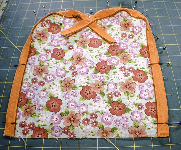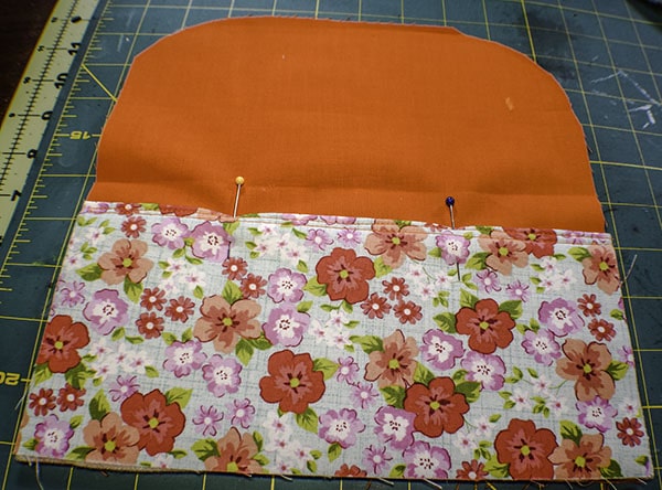 Place the lining right sides together with the main outer piece matching the marks. Stitch the two pieces together starting on the top left side of the main outer side of the two pieces where the pins start in the photo all the way to the bottom mark on the right side. Â