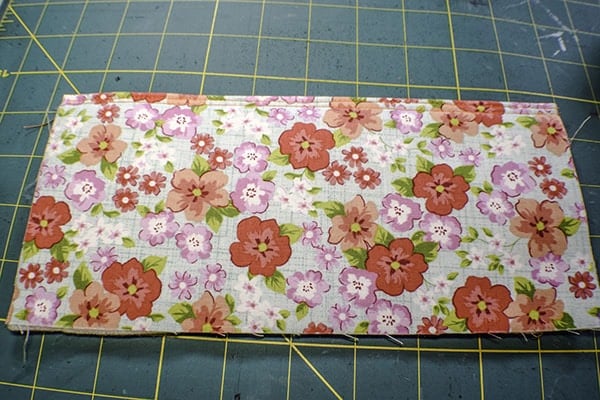 Fold the pocket piece that measures 9 5/8″ x 8 3/4″ in half lengthwise and press. Stitch two lines of top stitching along the fold.Â