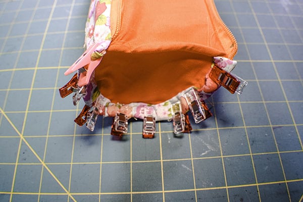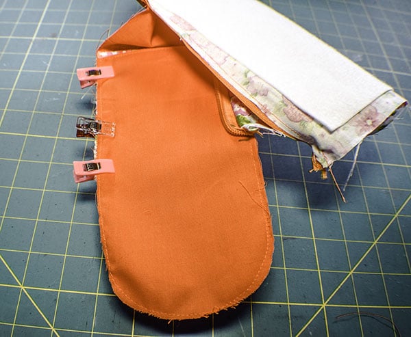 Leaving the piece wrong sides out place the side of the bottom on the side of the pocket piece matching the marks. Place the zipper on top of the side of the bottom and the pocket piece as shown and clip. Stitch from the bottom mark to the rest of the stitching. Turn right sides out. Fold the bottom under and clip all the way around. Stitch using a 3/8″ seam allowance. This is a little fidgity so take care with this step. Â
