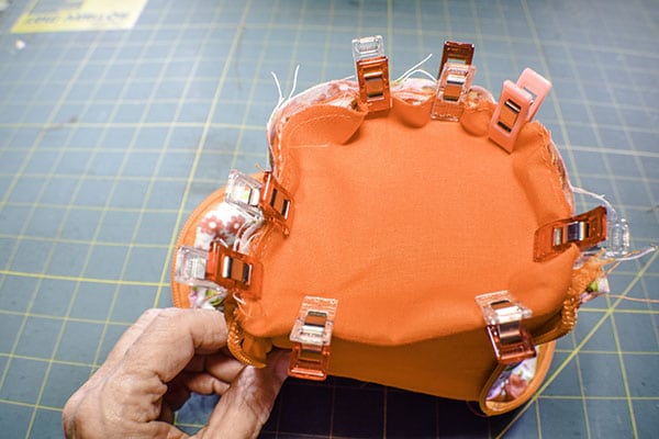 Take the binding piece and place it right sides together with the main outer piece and stitch from edge to edge leaving excess binding on each end. Fold under the excess binding and fold under the rest of the biding to enclose the raw edges and clip. Hand stitch the binding to the bottom using ladder stitch.Â