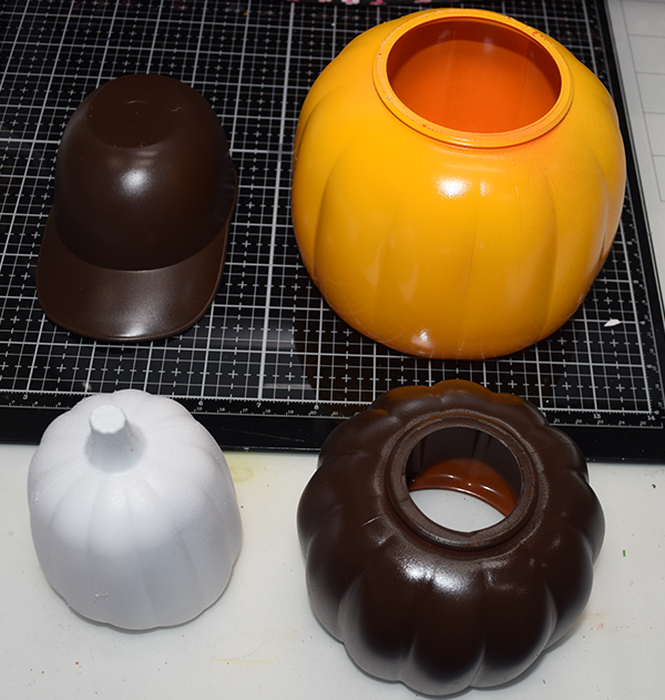 My sister-in-law's team is the San Diego Padres so I chose white, gold and brown for my pumpkins. The white was used for the baseball top pumpkin while I used brown for the center and gold for the bottom. Make sure to lightly sand the pumpkins before spraying them. Spray light coats to cover the pumpkins and hat. I had an ice cream hat that I got at a St. Louis Cardinals game (my team) that I spray painted brown.