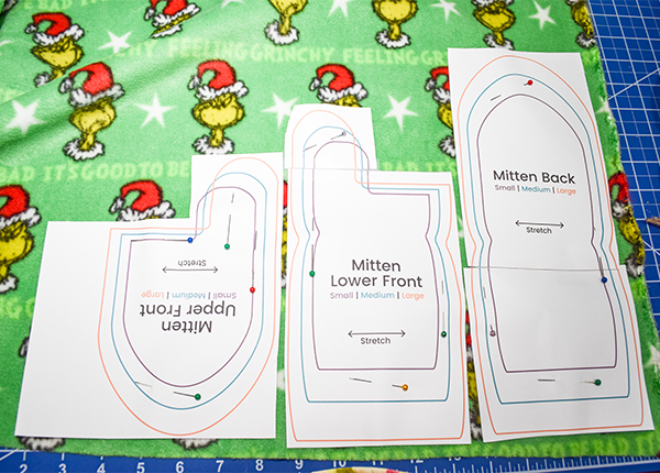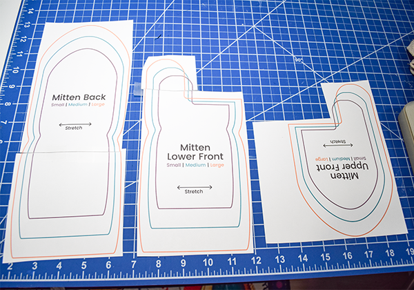 You will need to print the pattern. Tape the pieces together and choose the size you would like to create. For one mitten cut out three outer pieces and three lining pieces. For the other mitten flip the pattern over and cut the same six pieces. When cutting the faux fur use small snips to keep from cutting too much pile and to prevent shedding.