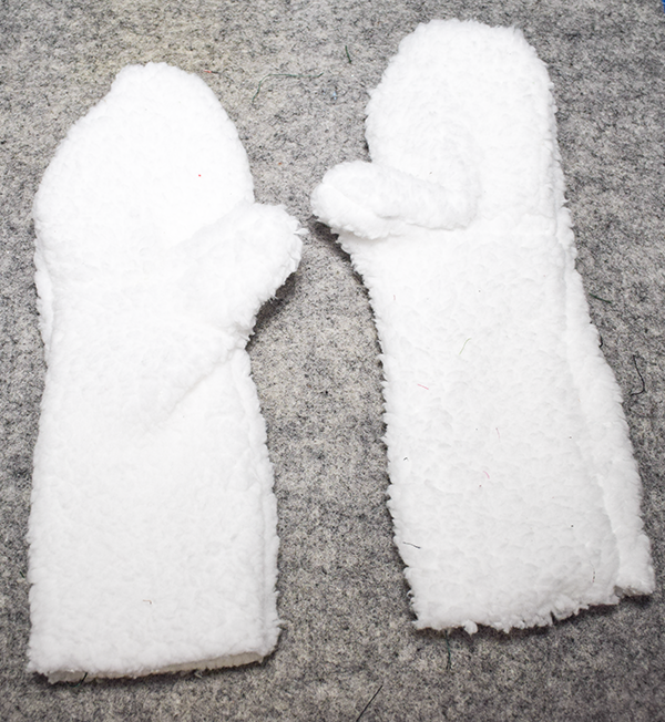 Using exactly the same steps for the fleece side create the faux fur mitten for both hands. Turn the faux fur nightsides out.