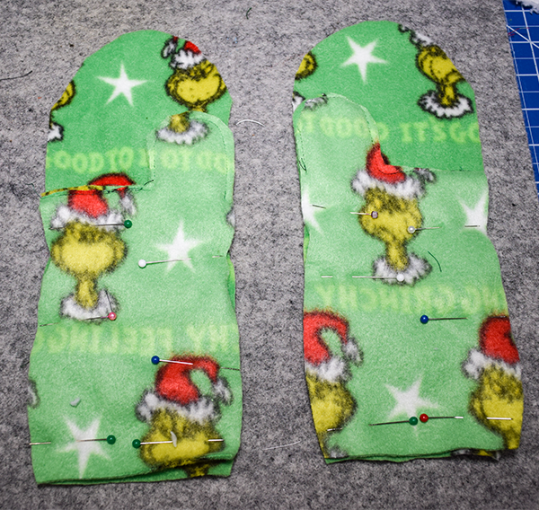 Place the fleece fronts right sides together. Using a 1/8″ seam allowance stitch across the horizontal line that will be the palm and around the thumb. Once you reach the spot just across from the palm line stop and back stitch.