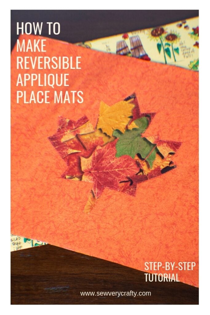 Thanksgiving is just around the corner so I decided to raid my remnant stash again to make these fun reversible applique place mats. These place mats are perfect for the Thanksgiving season with their autumn patterns and harvest fabric. You, of course, can make a more subdued version of this same project but as usual I love colors and am using them here. Fall is a colorful time of year with its oranges, golds and greens so I wanted to highlight them in my applique for this project. If you have never done applique this is the perfect project to get started. It is very simple and requires only basic sewing skills to create these cute little place mats.