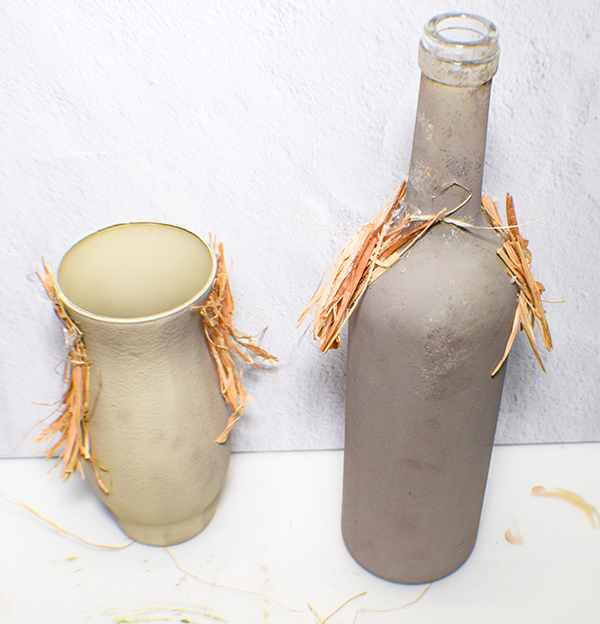 Place the straw onto each side of the neck of the bottle so that it hangs down a bit. You can use e6000 with a little hot glue to secure the straw.