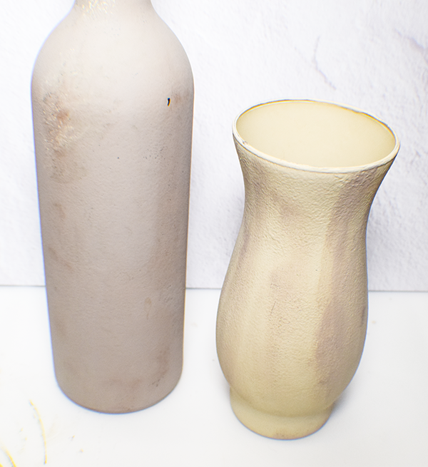 I used oatmeal and castle chalk paint for my scarecrows. Paint the glass in the color of your choosing. Chalk paint is a good base for this project. I used a foam pouncer for this to get a more even finish. Let the paint dry completely. You can move the process along using a blow dryer. Paint a second coat.