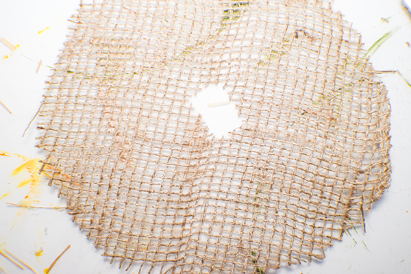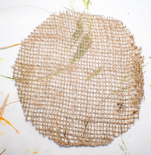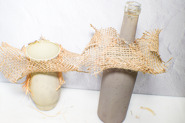 I created the hats in two steps. First, cut a piece of burlap in __” x __” squares. Trim off the corners to make a circle. Measure around the neck of the glass you are using. Cut a hole in the center of the circle. Hot glue the brim to the glass. Slide the circle over the neck of the bottle and over the straw. Take a rectangle of fabric to create the crown of the hat. Wrap the burlap around the neck so that it covers the whole thing with a little left over at the top. Hot glue the burlap together.