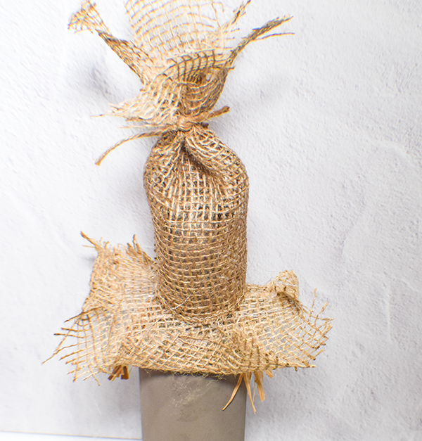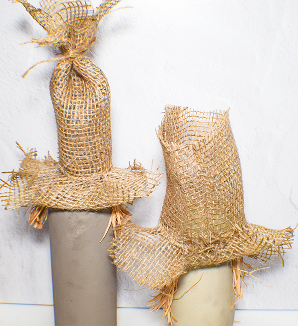 Fill the top of the hat with dried moss. Add a piece of autumn fabric around the hat. Glue it to the hat to secure. Add some additional dried moss to the brim using glue. Add some fall florals or leaves. Cut out some squares of burlap and glue those onto the hat to show age. You can paint the squares if you like. Add any other embellishments you like to finish your wine bottle scarecrows.