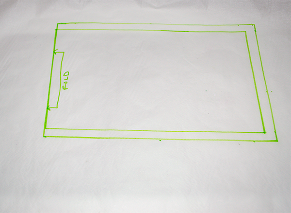 Using your pattern paper, divide your bust measurement by four to get the width. Draw a line across the paper with this measurement. Draw a line down from each end of the first line that equals the measurement you determined for the length of the top. Join the lines to create a rectangle. Add a 1/2″ seam allowance on one short side and the two long sides. The other short side will be cut on the fold. Cut out the pattern.