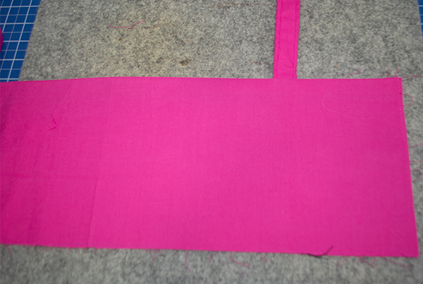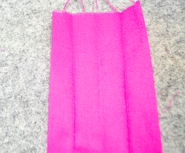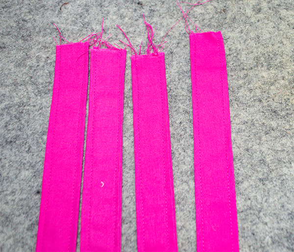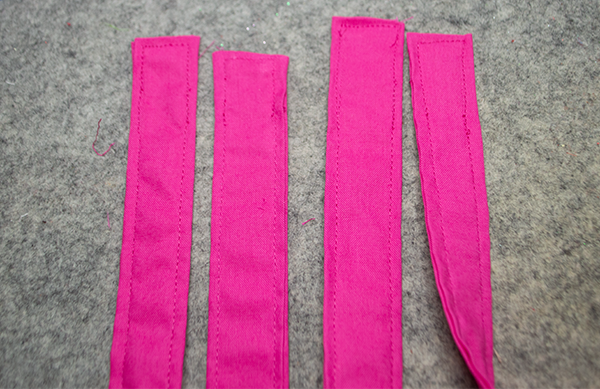 Take each strap piece and fold one end down about 1/4″ and press. Fold the long raw edges to the center and press. Fold in half lengthwise and press again. Topstitch along both sides of each strap.